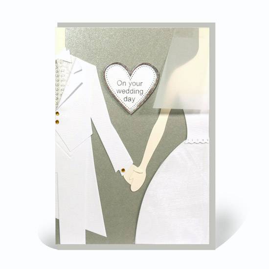 The wedding card bestows a simple yet warming design. It features a handmade couple paper-cut which enhances its uniqueness. Just send your greeting to your friend and beloved one's wedding with this distinctive card.