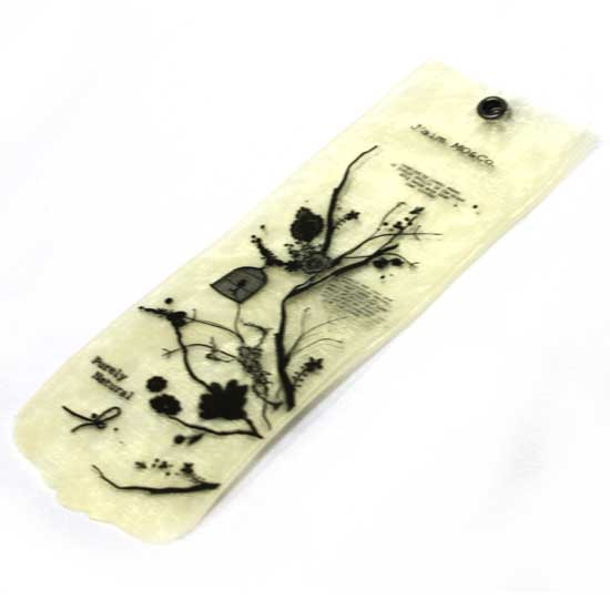 This pictured hang tag is composed of organza ribbon for a sheer texture. The hang tag is very lightweight and will not distort the shapes of your garments. Customized logos can be printed on the tag.
