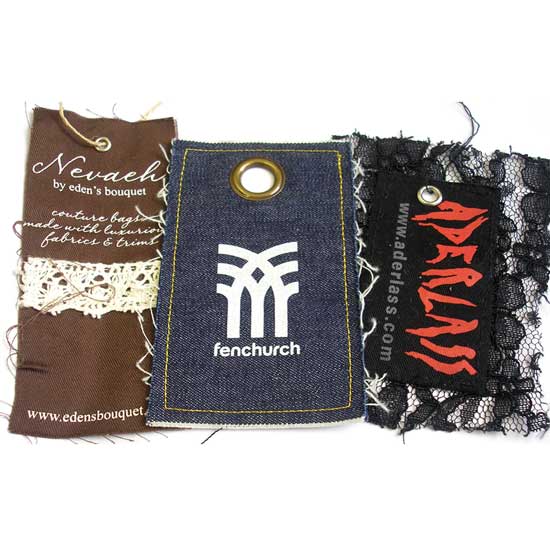 As shown is a series of hang tags made of fabric pieces. The tags feature color prints of the brand logo with decorations of lace. The metal eyelet allows easy attachment to garments.