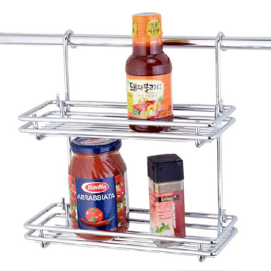 This hanging kitchenware rack is an ideal addition to your modern kitchen. It is made of quality materials for durability. This chrome plated rack is designed with two layers.
