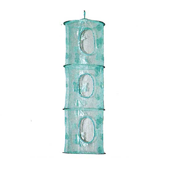 Displayed here is a laundry bag with a hanging design. It comes with a patterned design for added elegance. This hanging laundry bag stores your shirts and socks in a neat way.