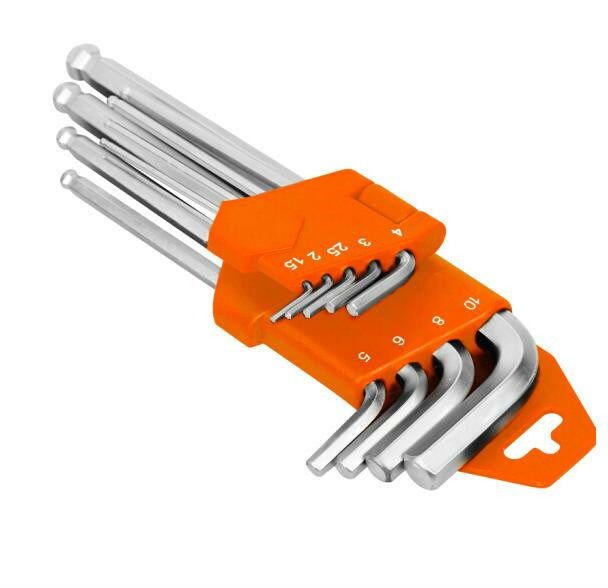 It is a Hex Wrench, which made of Chrome-vanadium Steel. It included 9 pieces of steel with different size. Ball ends allow up to a 25-degree entry angle to reach around obstructions Chamfered, straight ends offer a snug fit and insert smoothly into fastener head, reducing wear. Black oxide finish protects against corrosion without added plating that could chip off under high-stress contact. Long arm/short arm design offers extended reach on one end and extra leverage on the other