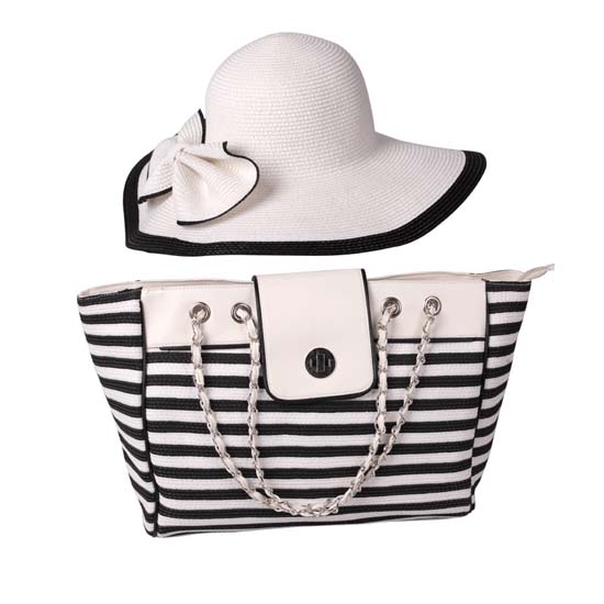 Displayed is a fashion set that includes a cartwheel hat and hand carry bag. The hat in chaste white is trimmed with an eye-catching knot. The bag also features alternate black and white stripes that look fashionable.