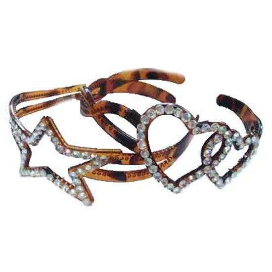 These are plastic headbands for girls and ladies. They are of curved lines with leopard's dots. They feature a star and two hearts made of glittering stones respectively.