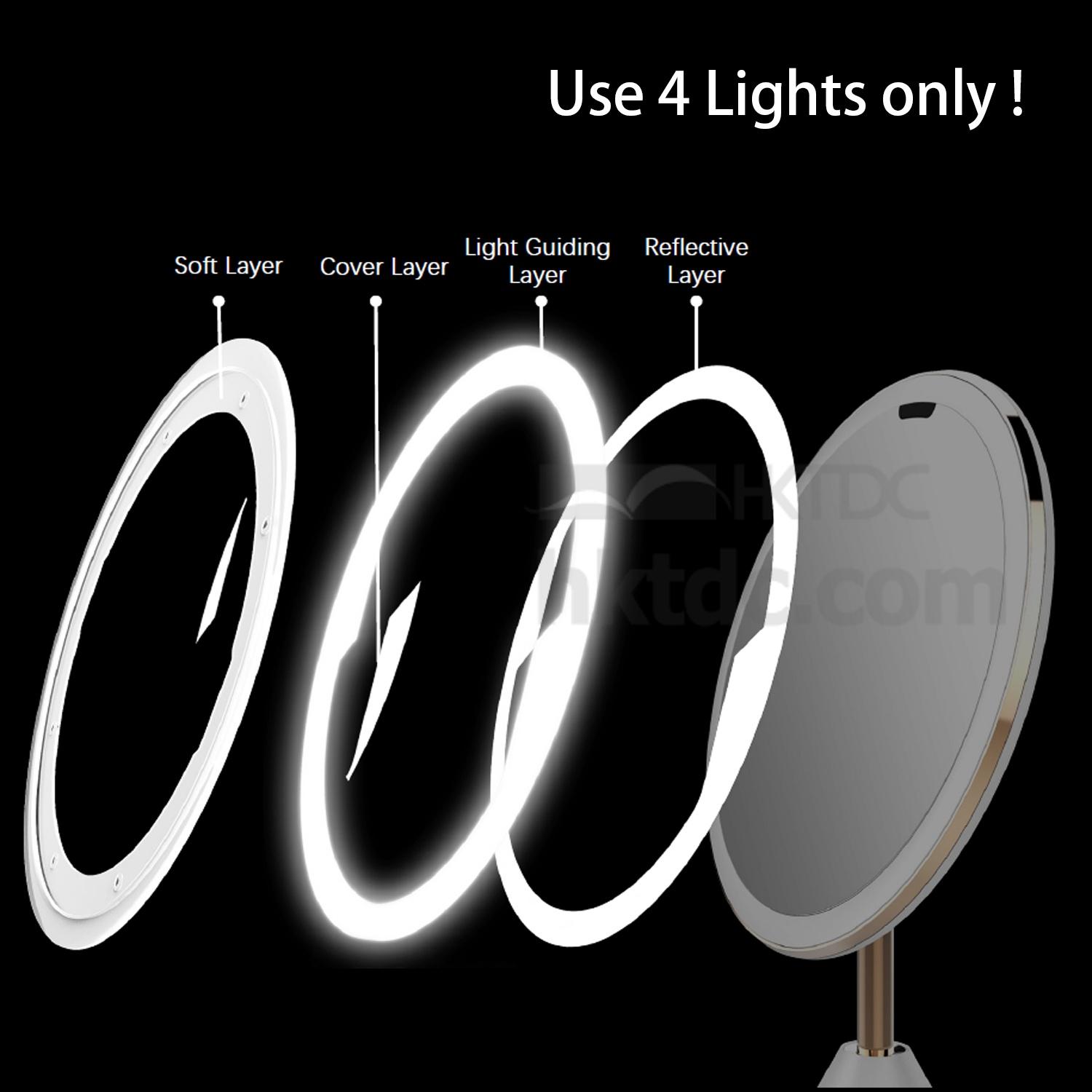 • The smart sensor component on the back of the mirror automatically adjusts the brightness to a suitable level according to the room environment. - The light is soft on the eyes and provides a realistic makeup environment.