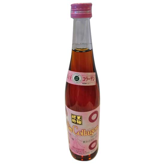 Displayed here is a bottle of health drink from Japan. It is rich in collagen for well-being. This health drink is made under strict quality control.