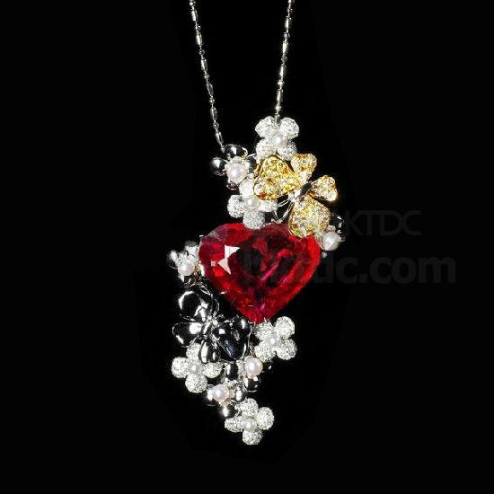 Compliment your outfits with this heart shaped pendant. It features a gorgeous piece of heart cut tourmaline in a charming red color. The piece of tourmaline is luxuriously decorated with flowers made with glittering diamonds on the sides. They make an exquisite contrast to each other and can give you the perfect adornment you need.