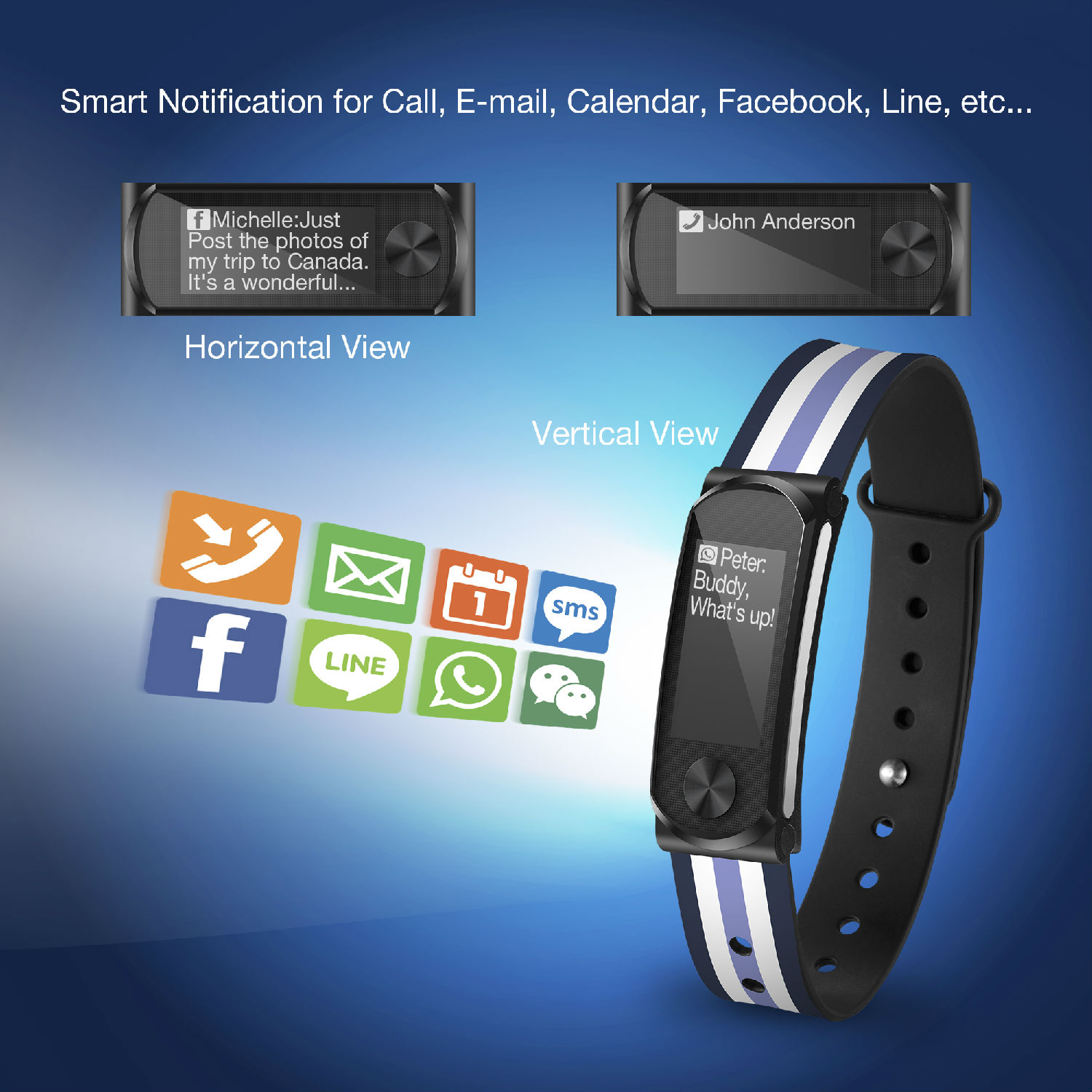 Complete support of smart notification alert for incoming / missed call with caller ID, calendar pop-ups, reminder, various App notifications including sender name & text message from SMS, and social media Facebook, LINE, WeChat, WhatsApp, Skype and Twitter. (We are the pioneer to have activity tracker support smart notification on both iOS / Android since 2014 Nov)