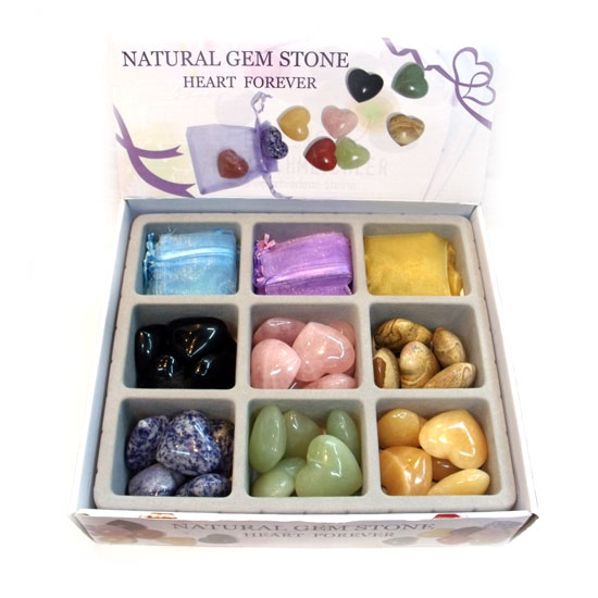 Featured here is a set of semi-precious gemstones in a heart-shaped design. The smooth, polished gemstones exhibit beautiful colors and textures. They are wonderful gift choices for your friends and family.