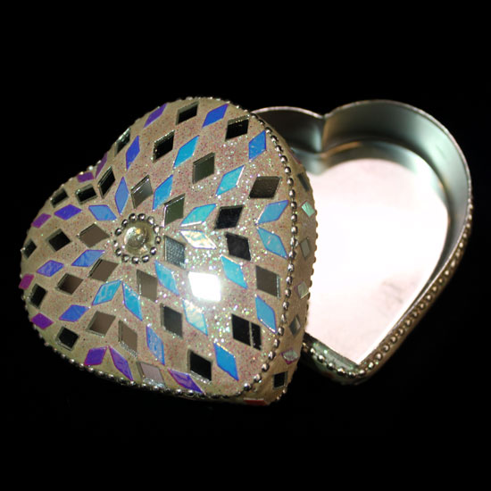 The picture showcases a heart-shaped jewelry box printed with numerous colorful diamond patterns. The box is finely polished and decorated with glitters, showcasing a sense of elegance and refinement. Keep your jewelry collection well organized with this cute and compact jewelry box.
