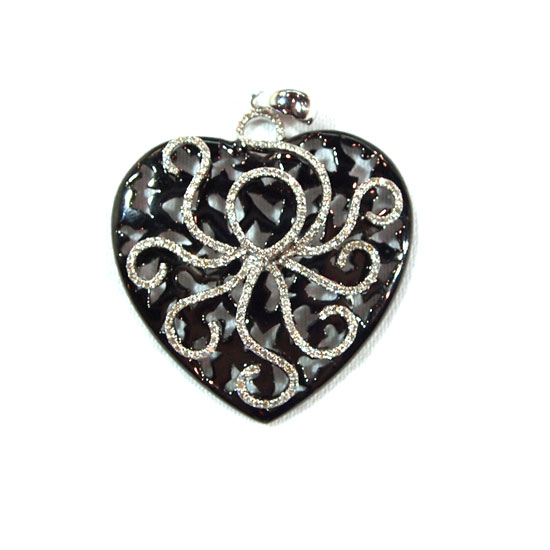 This pendant captivates you with its romantic heart-shaped design. The dark background is enlivened by an octopus-like decoration on top, which is paved with glittery diamonds. This pendant makes a unique and impressive present for your beloved one.