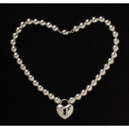 This rose gold plated silver necklace has a total length of 43cm. It comprises of small silver balls with a lock pendant. A hollow key hole is situated at the center of the lock.