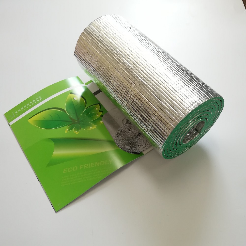 Such material combination provides excellent functions of thermal reflection, heat insulation and anti-radiation. So it is an economical solution for a wide range of industrial, manufacturing and consumer applications, such as for industrial sheds, commercial buildings, home insulation, under wood or laminated flooring, roof insulation, carpet underlay, pipe and vent-pipe jacket and construction.