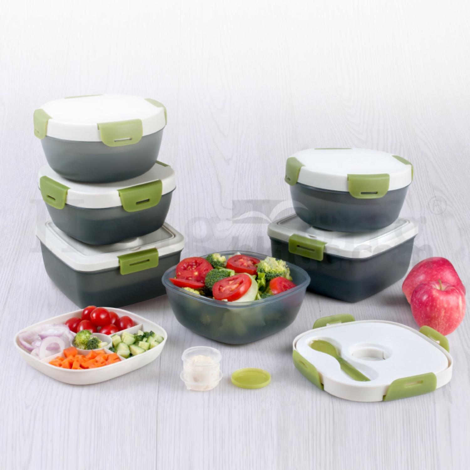 It consists of a 1.2L square big container, one 50ml salad sauce box, one spork, one tray with dividers and ice pack.