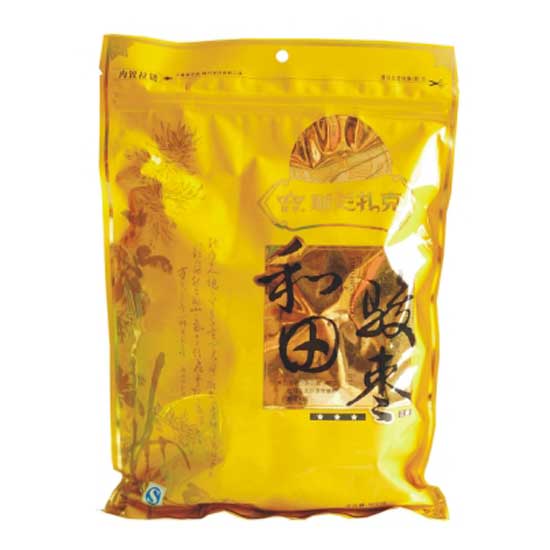 Displayed is a pack of Hetian dates that is carefully picked for a high quality. Rated as three-star, this date has a healthy red color and is aromatic. This delicious Hetian date also has multiple health benefits, making it a good choice for a snack.