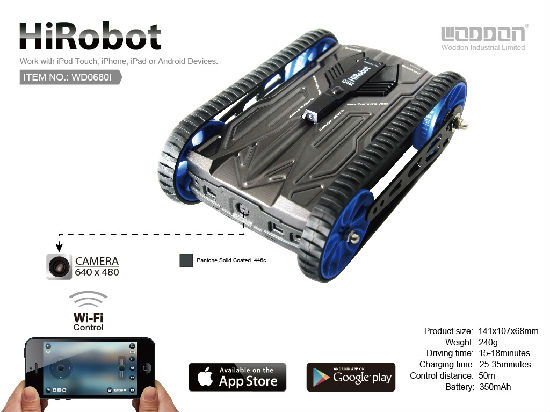 HiRobot work with iPod touch, iPhone or Android devices. Long distance remote control. Identify the driving route automatically. photo and video recording. The driving direction is detected by the infrared sensor under the tank. it can change another pathway freely when it drives at the parthway. the robot can detect dropping. When it drives approaching the edge zone, it can return by itself and avoid dropping off. specification: driving time: 10mins, charge time: 50mins, control distance: 30-50 meters. Battery:3.7V Li-Po 350mAh, Size: 14.1*10.7*4.6cm