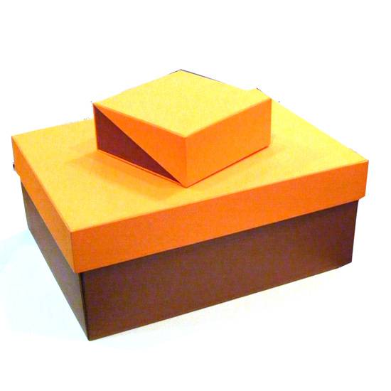 This is a series of high contrast paper boxes. The color are matched with contrast that makes the paper boxes sharp and eye catching. This sample box is matched in an orange yellow cover to a brown base.