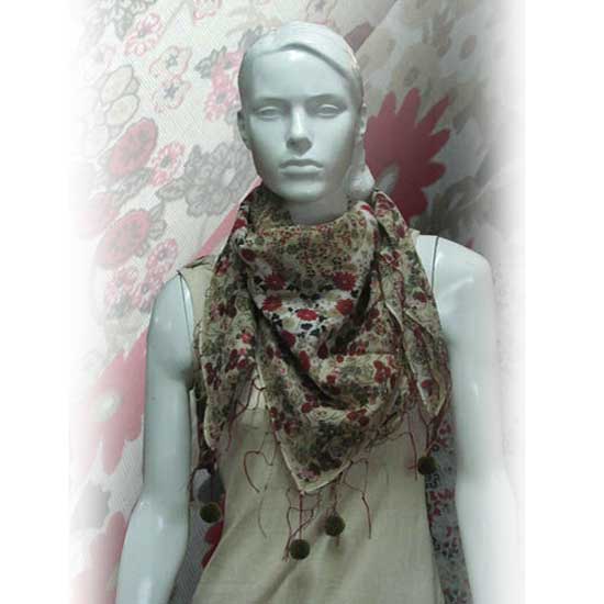 This is a high-fashion scarf with a chic and elegant design. It is meticulously printed with colorful and exquisite floral patterns, and adorned with dark brown dangling balls. The soft and smooth texture offers enhanced comfort.