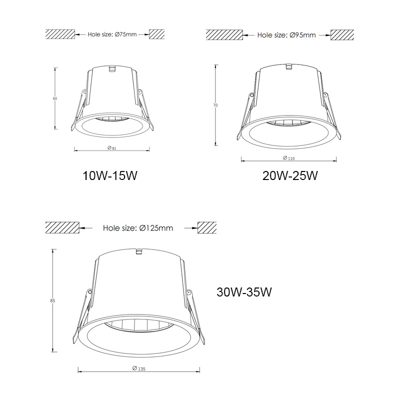 | LA-TD1801-75 | 10W-15W | Ø81*60mm | Ø75mm | CREE/ Bridgelux | 15°/24°/36°/60° | Ra>80, Ra>90 | 3000K/4000K/5000K | Alum. | AC85-265V |
