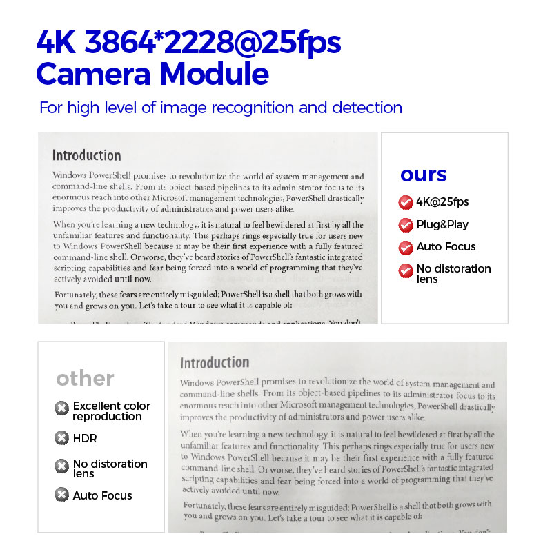 High Frame Rate: This camera module has a high frame rate at 25fps on full 4K 3864*2228 of resolution. Ultra clear and high quality of video image effect, perfect for high-end of medical and beauty instrument, video conferencing and education equipment etc.