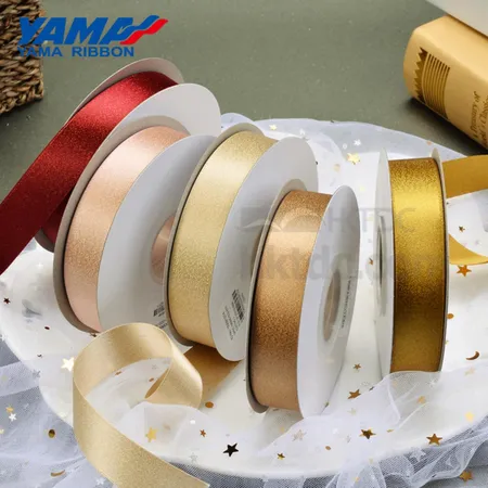 YAMA Gold Purl Satin Ribbon is made of 100% high quality polyester filament yarn and embellished by Gold Purl, luxury but low-key, full of nobility. YAMA keeps gold purl satin ribbon (NO.28866) for stock-sale with 14 colors and 6 sizes for option. With the characteristic of iridescence effect on its surface, it is the best choice for gift packaging and fashion brands.