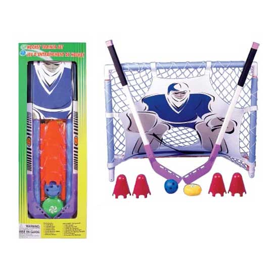 Featured here is a hockey goalie play set which comprises a hockey net, two hockey sticks, a few cones and pucks. It comes with a detachable goalkeeper for increased difficulty. This hockey goalie play set will give lots of fun for kids interested in learning hockey.