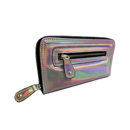 This purse is made of hologram fabric for a unique and fashionable look. It features a zip front pocket and a credit card compartment for holding credit cards. Around with a metal zip, this purse surely is a stylish addition to your bag collection.