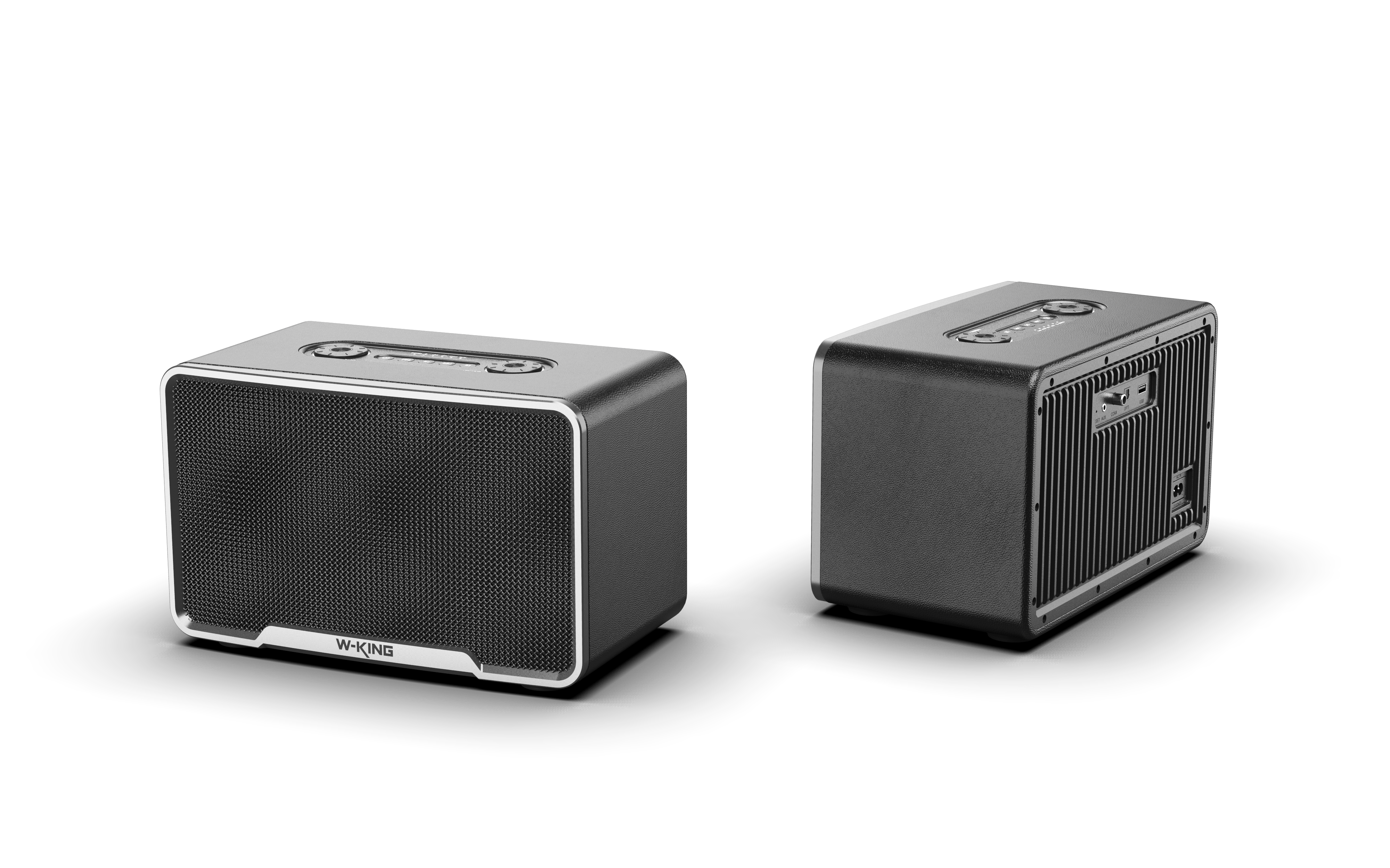 c. Visual details in convenient Cast-Aluminum handle, custom leather like enclosure, reimagined speaker grille.