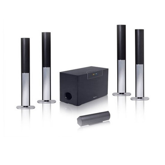 This is a home theater system that includes six units with a matching design. All the pieces are well designed to give you the ultimate user experience. This home theater system blends into any home decoration easily.