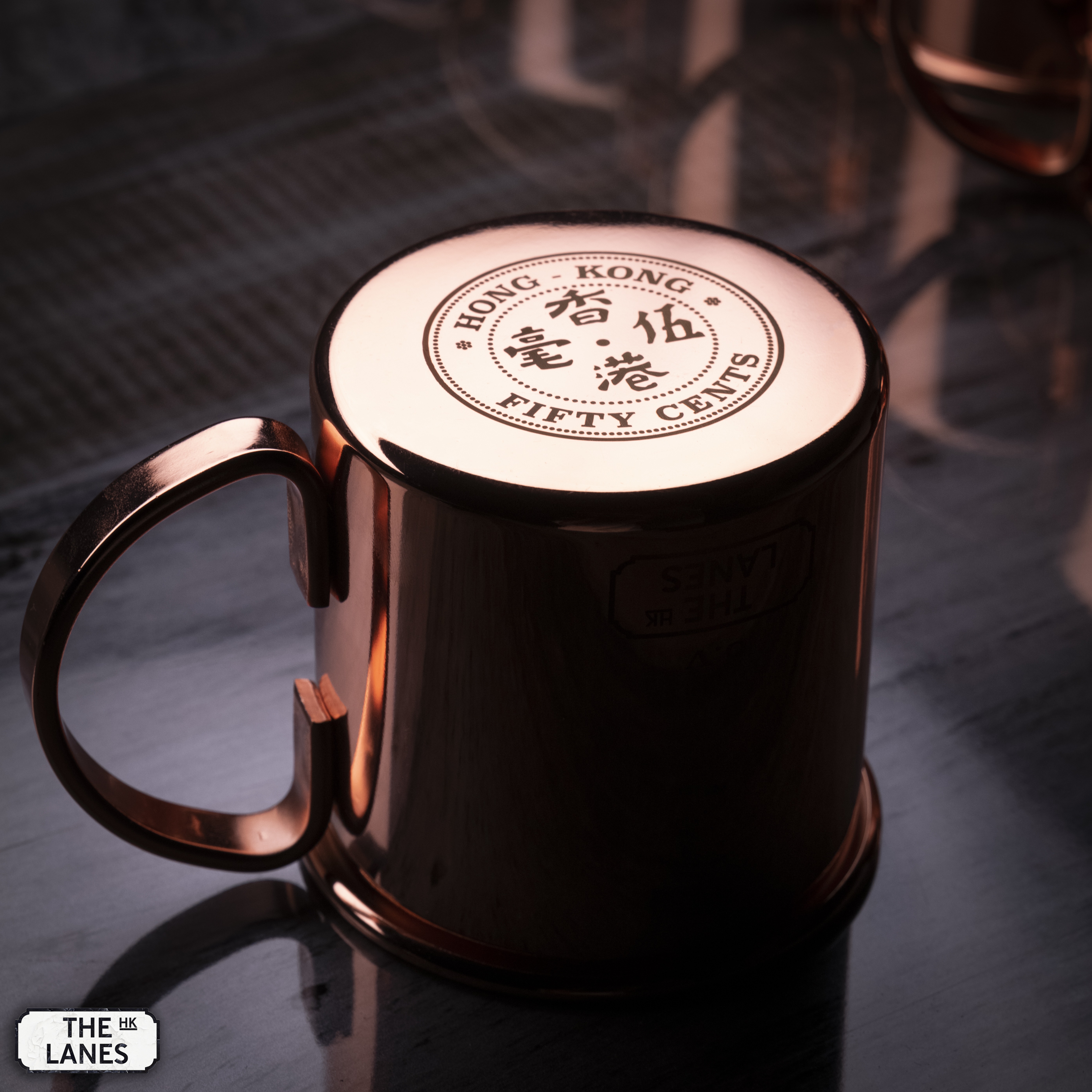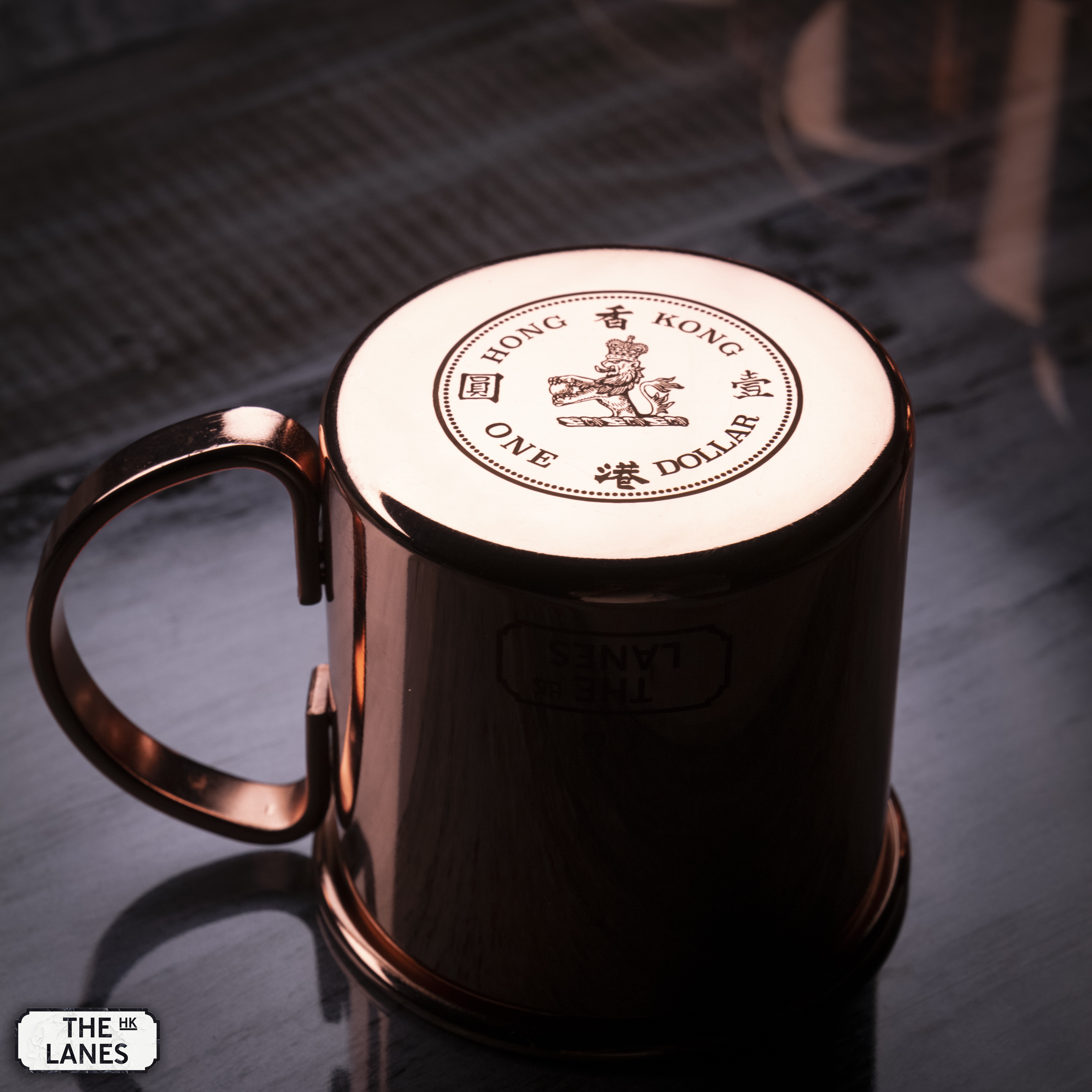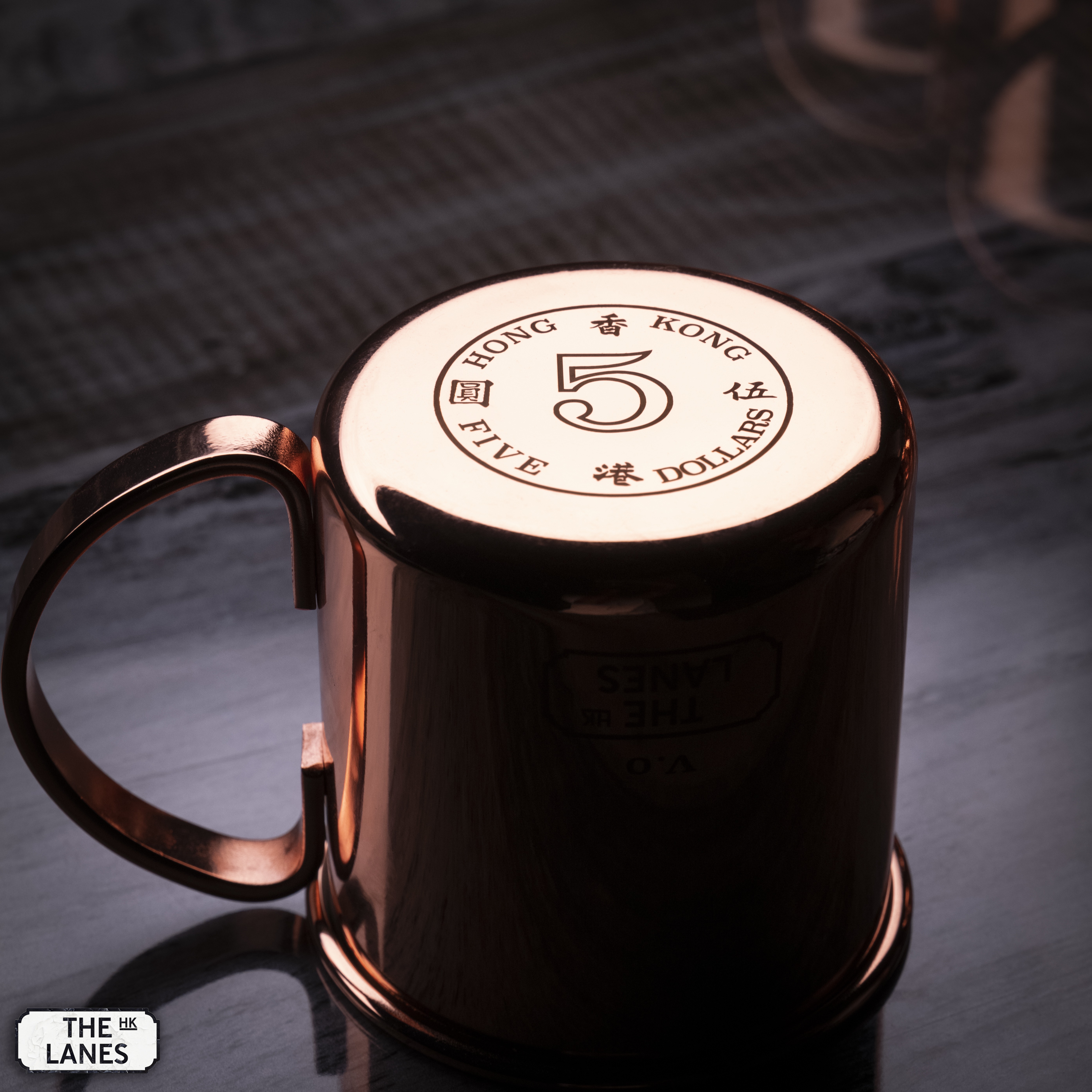 Stainless Steel mule mug with Hong Kong coinage design at the bottom. The idea is to flip the cup upside down when not in use or storage to help prevent dust and moist accumulate inside the mug.