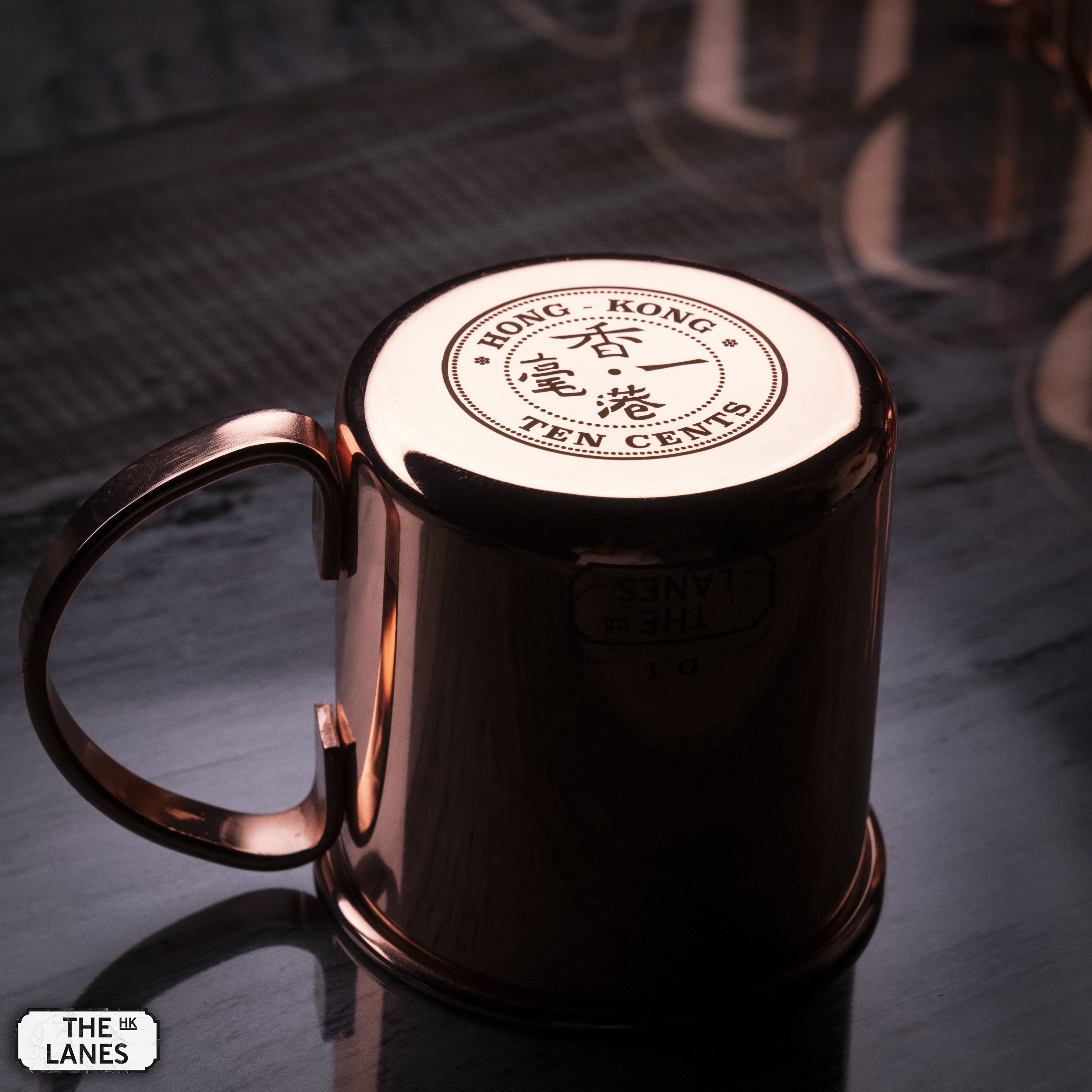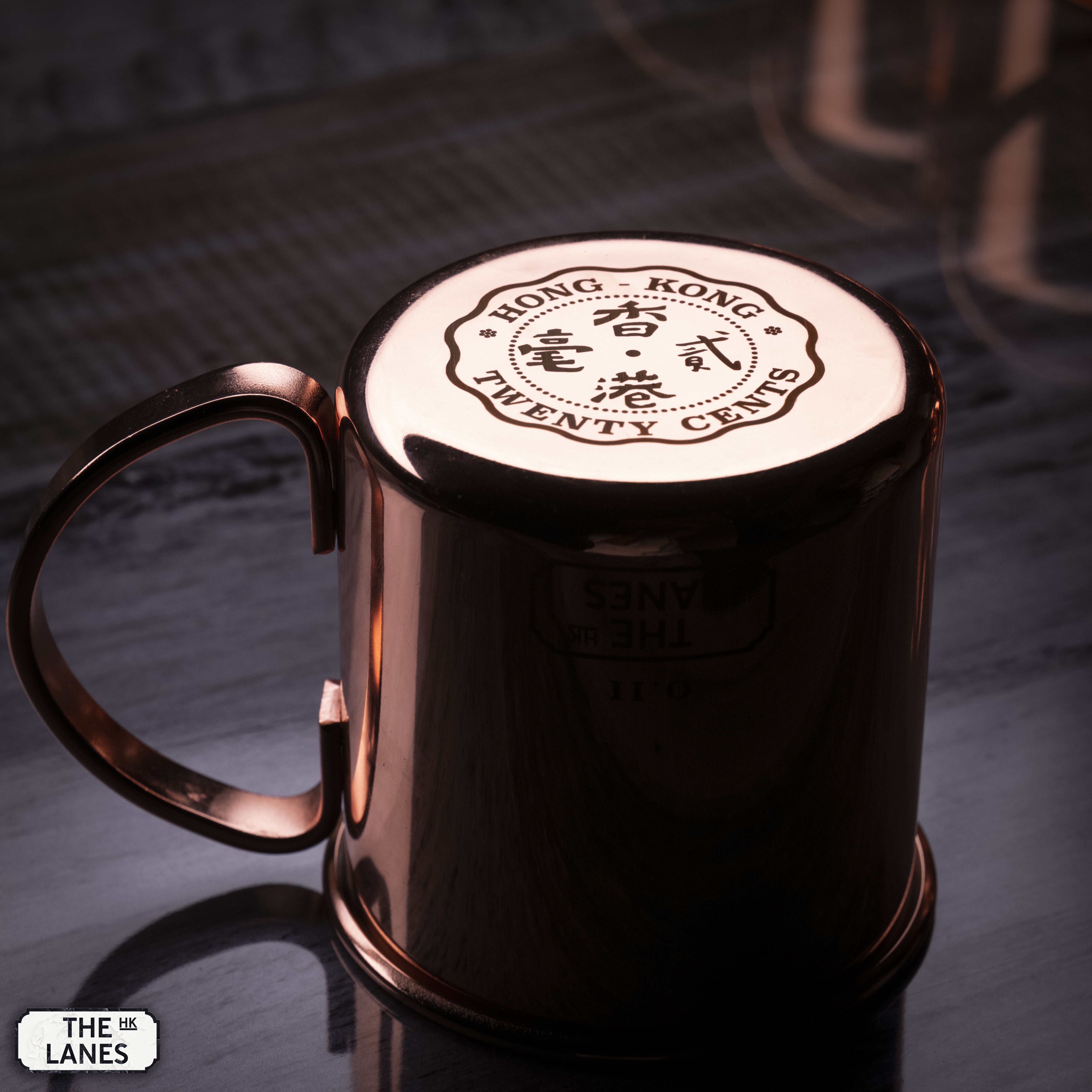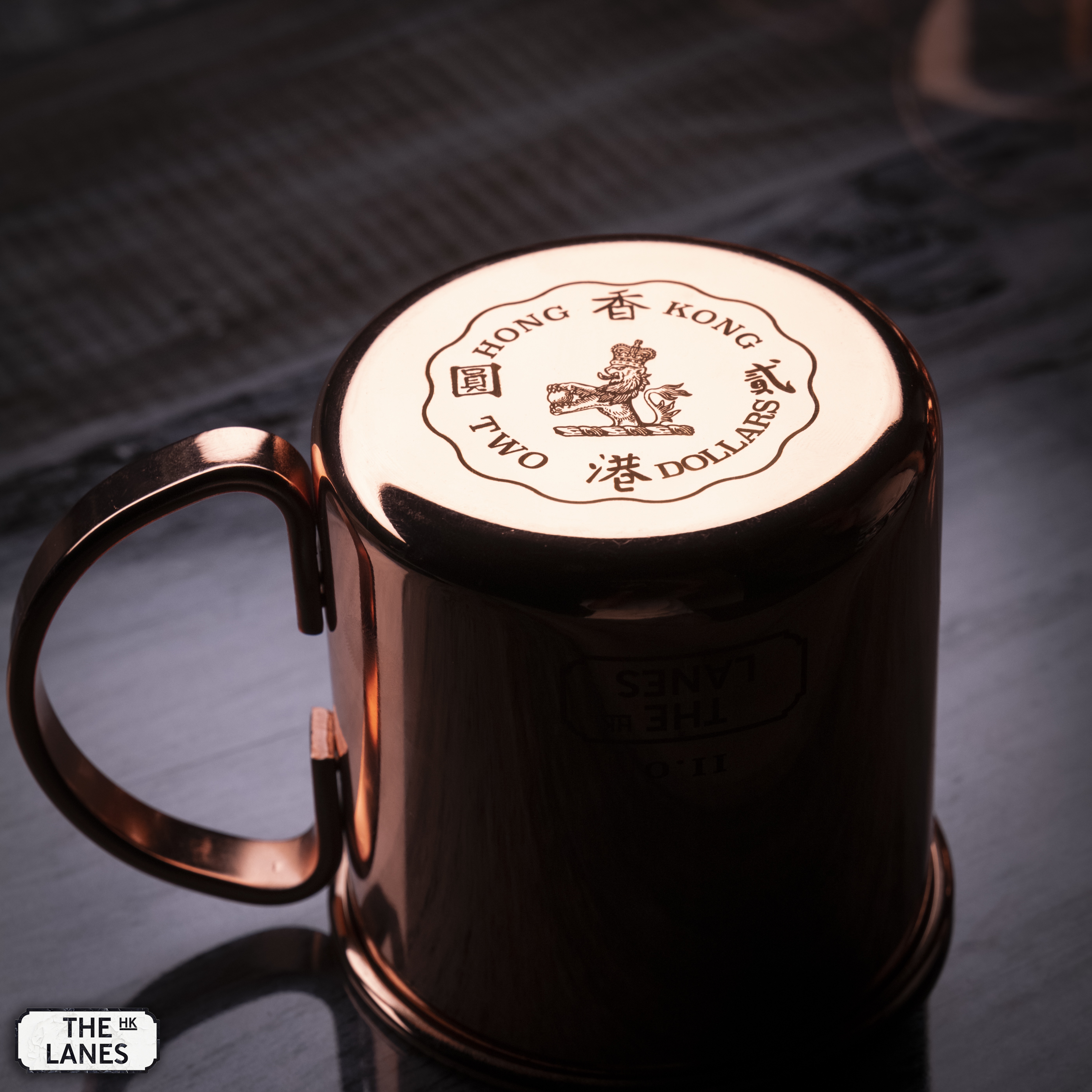 Stainless Steel mule mug with Hong Kong coinage design at the bottom. The idea is to flip the cup upside down when not in use or storage to help prevent dust and moist accumulate inside the mug.