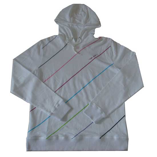 Featured is a sweater with a drawstring hood. The colorful diagonal lines on the front add a retro touch. Update your wardrobe with this sporty hooded sweater.