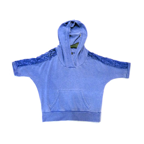This ladies’ hoodie T-shirt comes in bright blue for an eye-catching look. It is made of 60% cotton and 40% polyester for a comfortable touch. The short sleeves are designed with lace patterns for extra style.