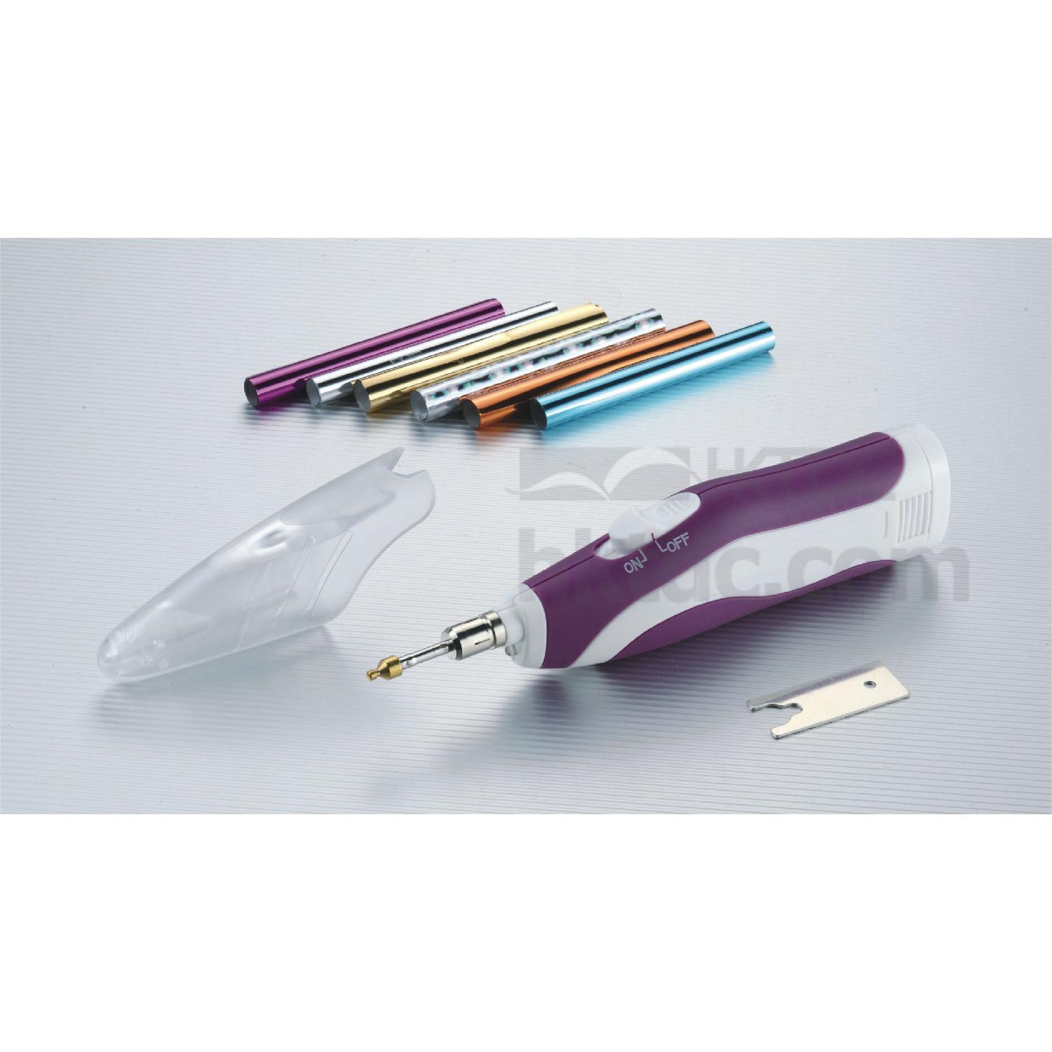 The pictured hot foil pen is powered by 3 x AA batteries and is ideal for hot foil stamping use. It flaunts quick heat-up and has a light indicator to brighten your work area. This hot foil pen has a durable anti-slip rubber grip handle and comes with a clear cap for protecting the tip.