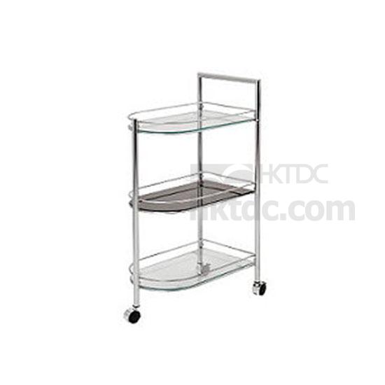 This is a trolley designed with three tiers. It features a highly durable metal frame for long-lasting use. This trolley is equipped with wheels for easy movement.