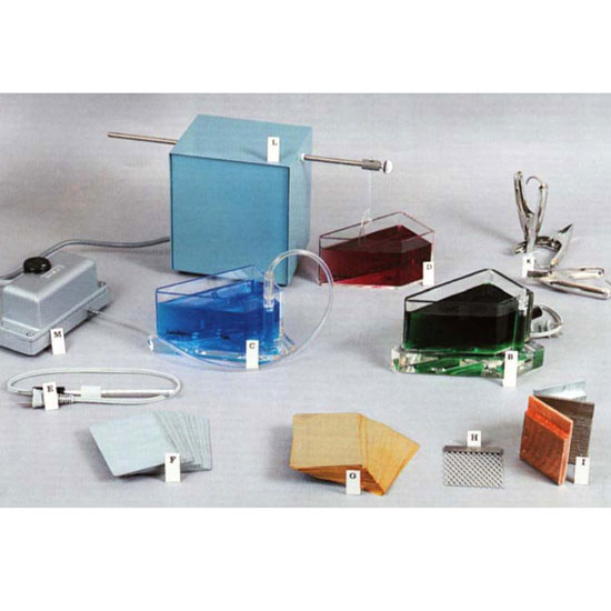 As shown are hull cells and other accessories for testing and analyzing the quality of electroplating. The items are constructed of choice materials for reliable quality. With these tools, the roots of plating problems can be easily dug out.