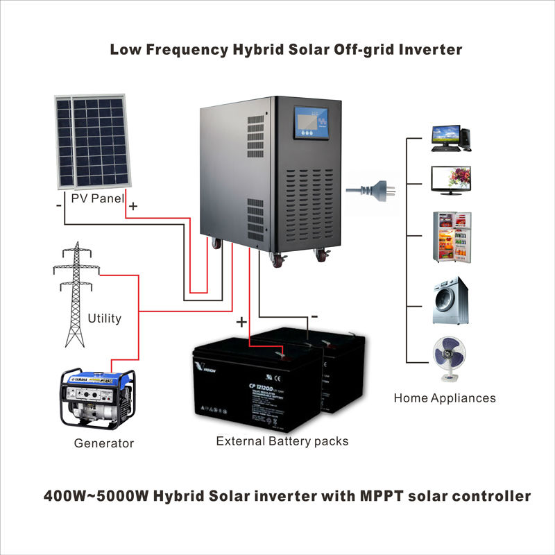 SIM series single-phase off-grid inverter consist of 3 functional modules: solar controller, pure sine wave inverter and insolated transformer. The controller adapts MPPT technology and intelligent battery management design which is very efficient and smart; integrated pure sine wave inverter and low frequency isolated transformer makes it with excellent overload performance, suitable for a variety of electrical appliances. It supports mains/generator input, take advantages of old diesel generators, saving initial investment and operation maintenance cost.