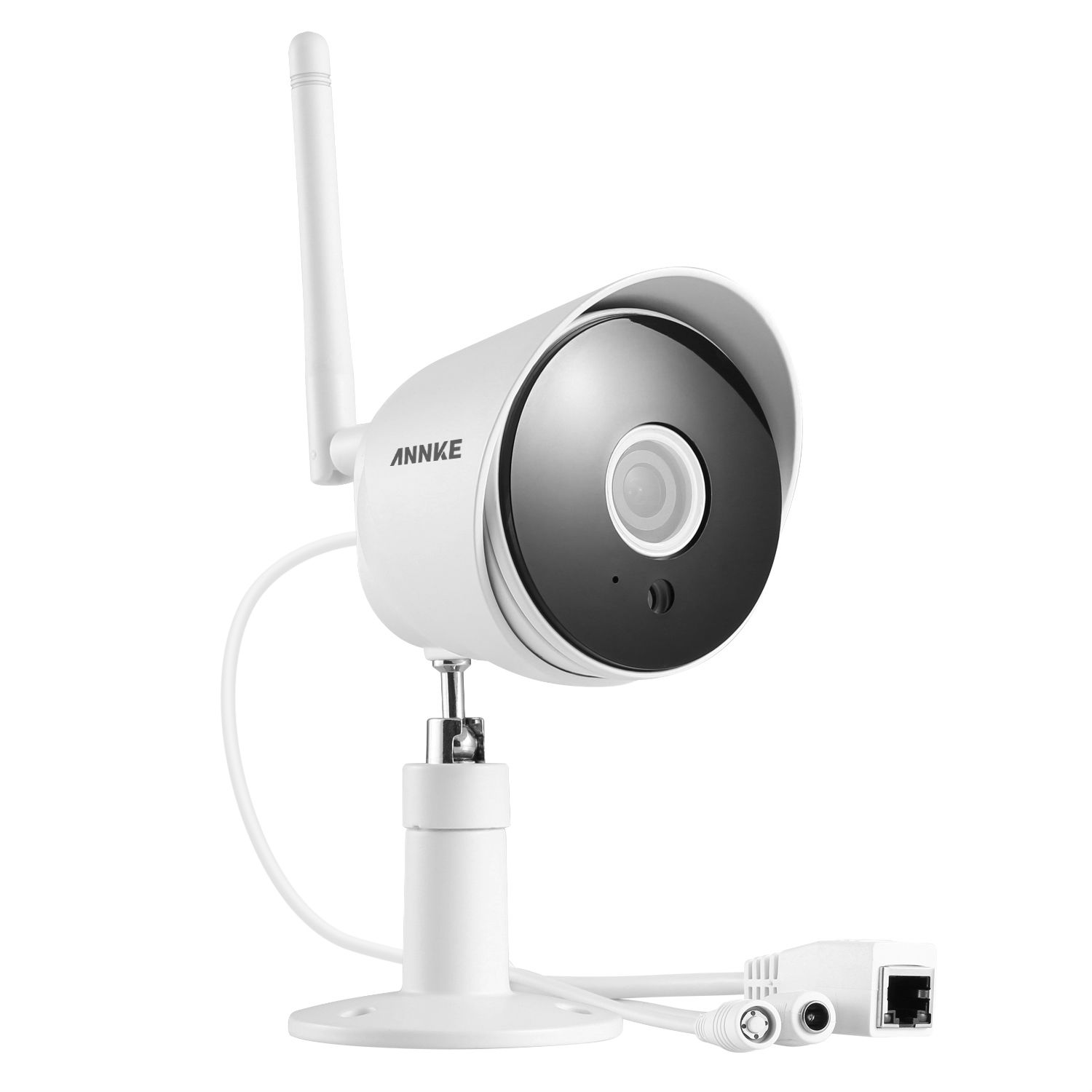 The highlighted IP camera is equipped with an antenna and has cables for connection. It comes in an elegant white tone and has a ball joint to offer an adjustable camera direction. This IP camera delivers superior video quality and is easy to install and set up.