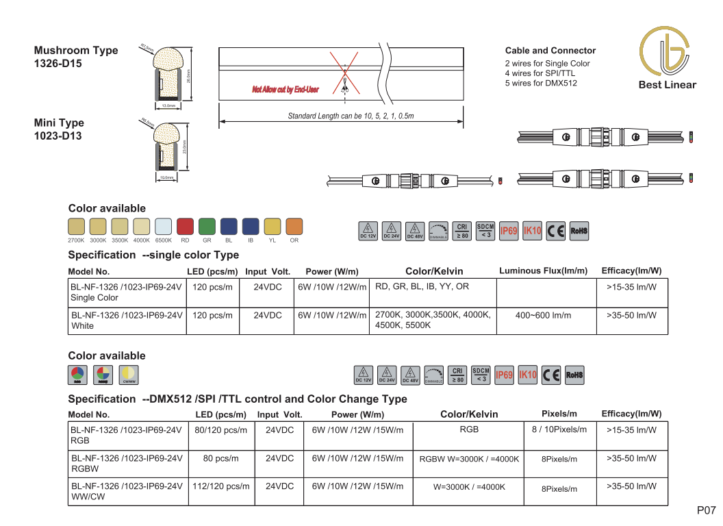 Continuously color linear effect as well as Glass NEON,Polyurethane Shell extruded with Engineered pre-mixed material,Fully fill by Uvioresistant PU glue,Hydrolysis-resistant, Weathering & aging grade,High quality SMD2835 & SMD5050RGB /RGBW LED with LM80 approved,Double layer 2oz copper FPC, Max. load 20 meters,Underwater connection can be load more LED Strip without voltage drop,