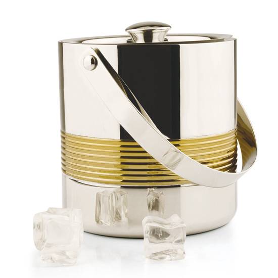 This is a stainless steel ice bucket. The ice bucket is coated with gold plating on the ridges, making it as a piece of premium tableware. The bucket is designed with a matching handle and a cover.