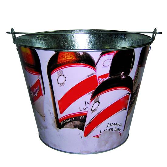 This ice bucket is made out of 0.30mm galvanized metal with an open top and a flat bottom, attached to a semicircular carrying handle called the bail.