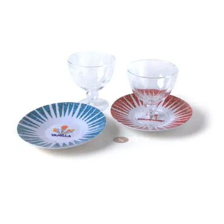 This is an ice cream cup with a matching plate. The cup boasts a neat and simple design with a clear body. The plate is printed with charming patterns for added charm.