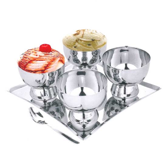 Featured here is an ice cream set which includes nine pieces. It comes with bowls, spoons and a tray. The set comes with a plain design and is perfect for serving customers in restaurants or cafes.