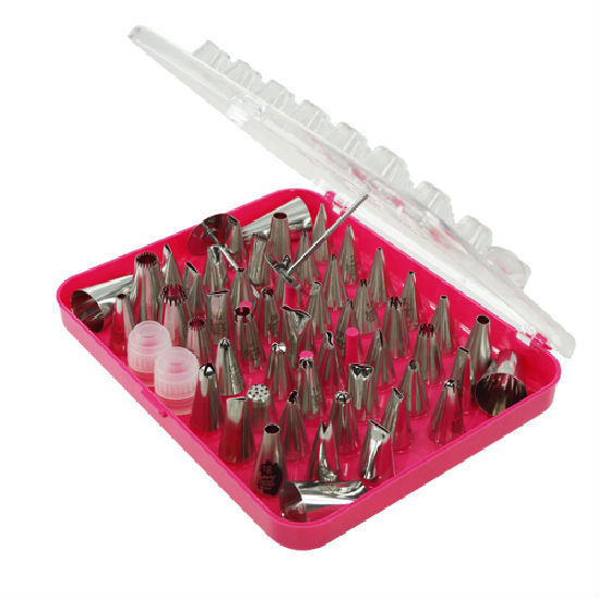 Take your cake decoration to an advanced level with this professional icing tip set. Containing 52 tips and 2 couplers, this helpful set lets you add final touches to a cake or top off a dessert for a signature design. A convenient box packs all the tools in place for neat storage. This kit is ideal for bakeries, catering kitchens and home use.