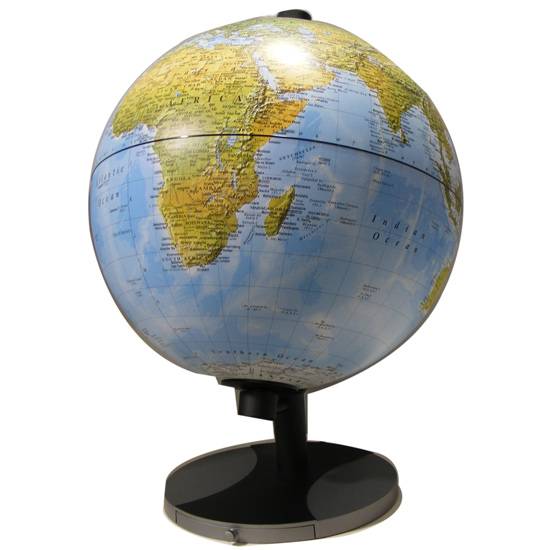 This is an illuminated globe. This globe has a small size, which space-saving and is ideal to be put on desk top. Although it is small, it satisfies all requirements of a large globe. It shows sharp, clear map images even for the smallest countries. It makes a great gift for friends.