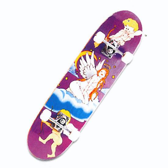 This classic skateboard comes with a heavenly drawing featuring angels. The four wheels are durable and strong. This skateboard enables riders to ride expertly on city streets, at the skate parks, and elsewhere.