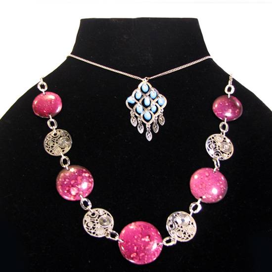 This is a set of Indian style necklace. The costume jewellery necklace set is designed with circular patterns in a matched set of 2 necklaces. The necklace pieces are of an ethnic and culture style and are very nice looking.