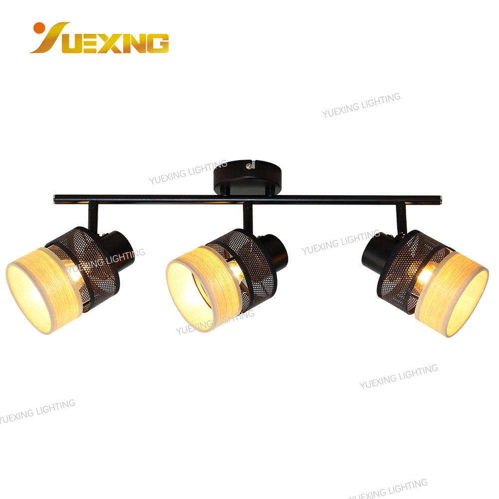 Indoor Ceiling Bedroom Market Wholesale Cheap Wooden Veneer Splicing Iron Grid Lampshade Acrylic Round LED E14 Halogen 3 Spot Lamp Indoor Spotlight
