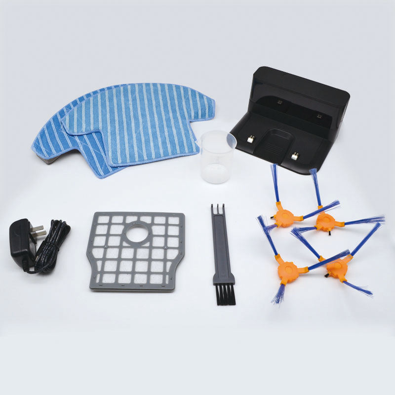 Accessories List: 1. Robot cleaner(including Li-ion Battery);2.Docking station; 3. AC Adaptor; 4. Clean Brush;5. HEPA filter(1pcs packed in dustbin box); 6. Side brushes; 7.Water tank; 8. Mopping cloth; 9 Instruction Manual; 10.App user guide; 11. Quick start user guide; 12 Warranty card.