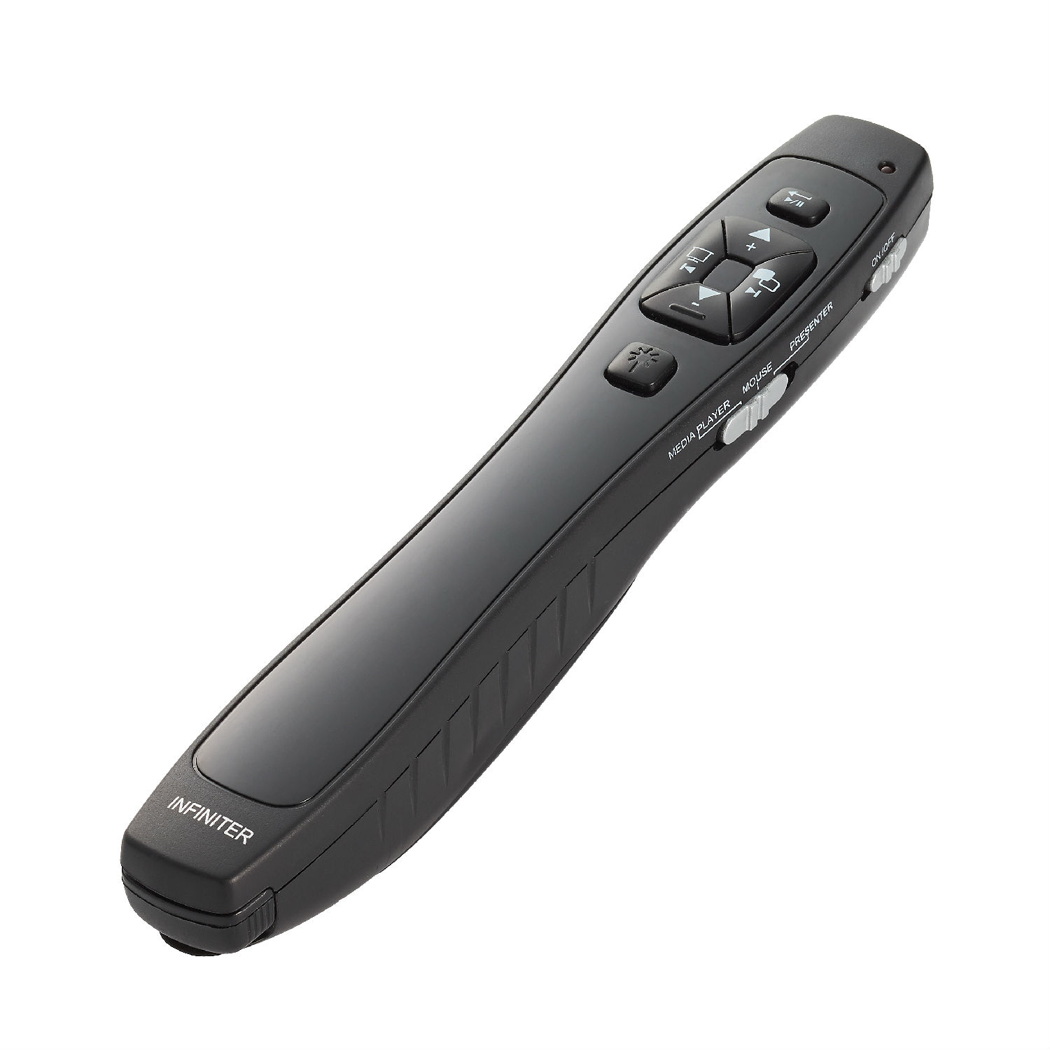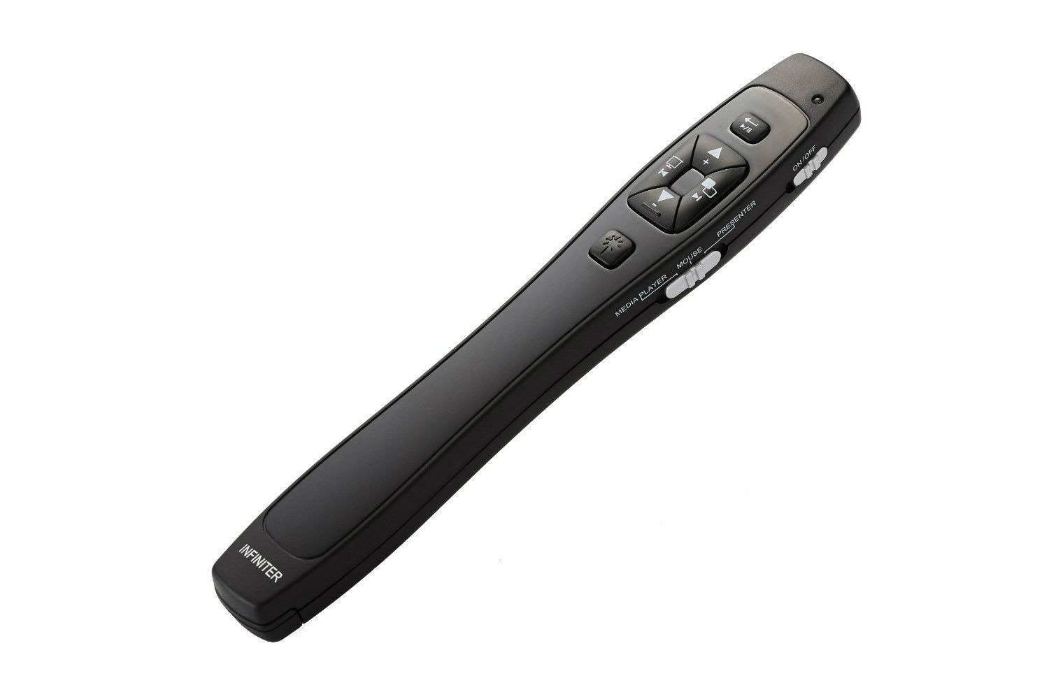 The INFINITER LR8 wireless remote presenter is sleek and stylish statement in the conference room. It fits comfortably into your hand coupling form and function. In addition to the remote control of your PowerPoint’s screen, ESC, page up, and page down functions; this presenter also has a wireless mouse that allows you to freely move the cursor in any direction you need. Another incredible feature is available when switching to the Media Player Function, you are able to control the media player system and adjust the sound level on your computer! Even further, the unique pen function can even help you to draw vertical lines or horizontal lines on any slide to highlight key points in your presentation. The receiver is integrated into the main body of the presenter and can easily be connected to your computer and can operate without any driver software. The LR8 uses only one AAA battery and has an operation time of 10 continuous hours. It integrates a 2.4G RF remote controller and the distance up to 15M for the meeting room. Convenient technological functions in one tool gives you the edge you need in your presentation.